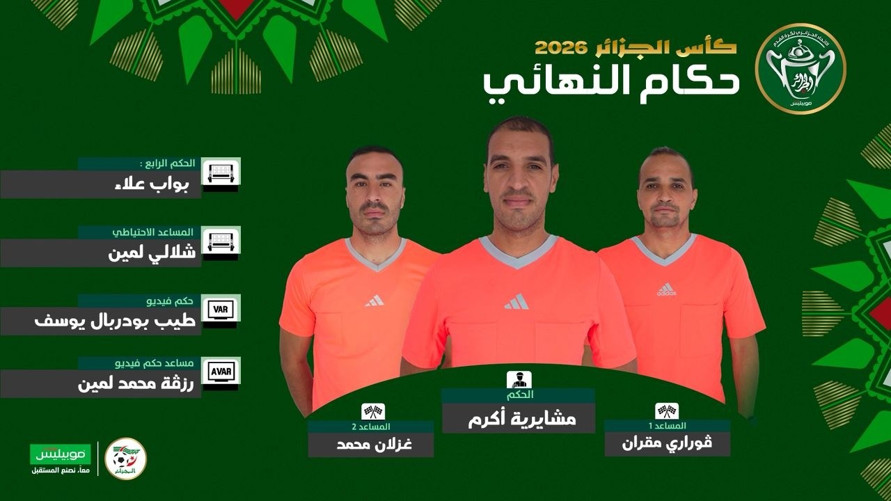 كشفت الاتحادية الجزائرية لكرة القدم “فاف” عن هوية حكام نهائي كأس الجزائر 2026، المرتقب غدا الخميس، بين شباب بلوزداد واتحاد العاصمة.