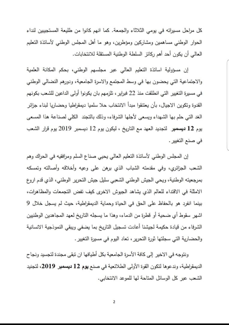 وإختتم البيان تحية شكر وعرفان للجيش الوطني الشعبي سليل جيش التحرير الذي وقف مع الشعب منذ بداية الحراك دون سقوط اي ضحية أوقطرة دم.