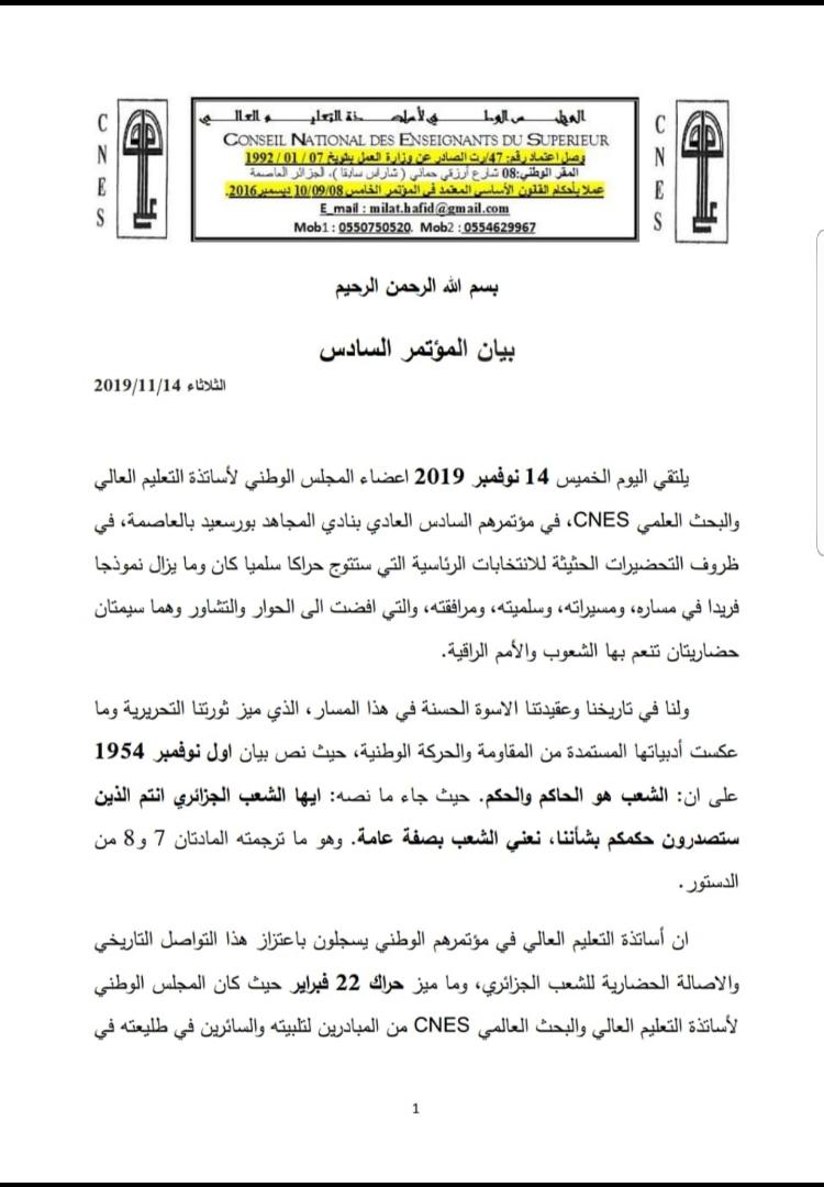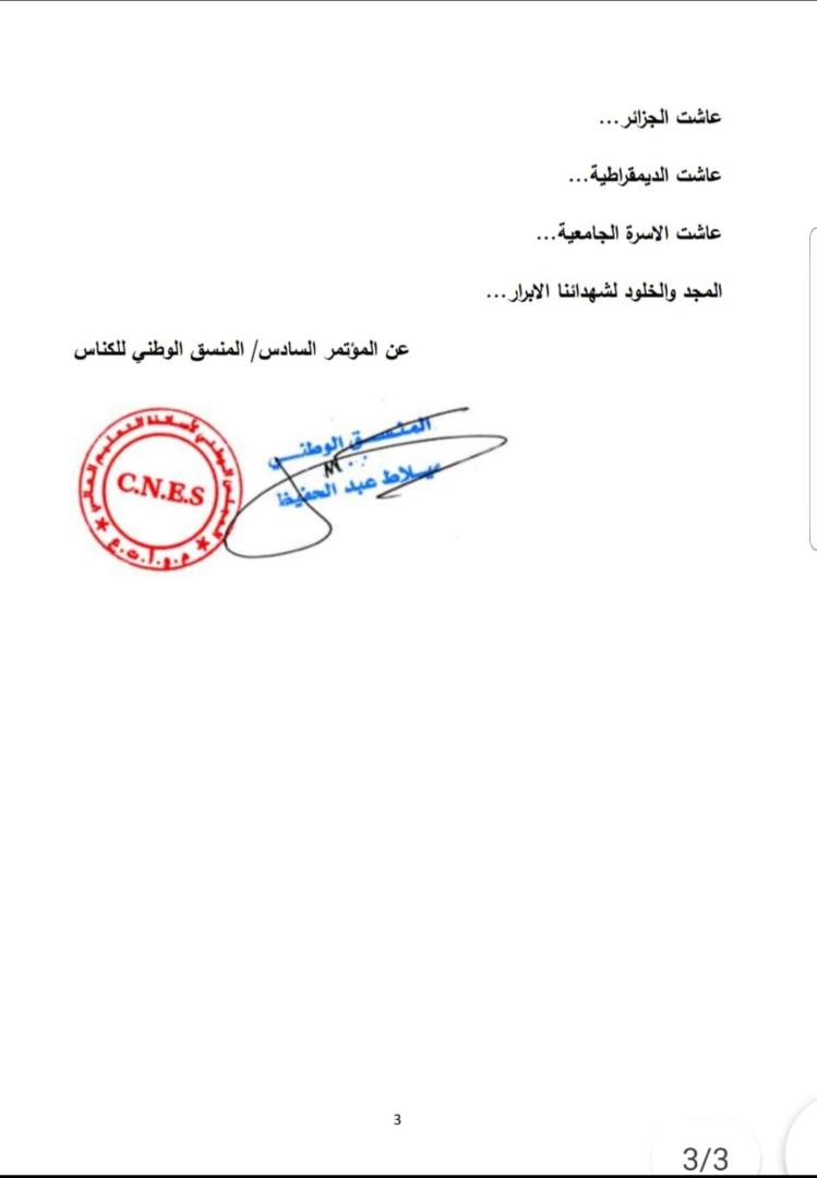 وجه أعضاء مجلس الوطني لأساتذة التعليم العالي والبحث العلمي رئاسة إلى الأسرة الجامعية بكل أطيافها من اجل التجند للإنتخابات الرئاسية.