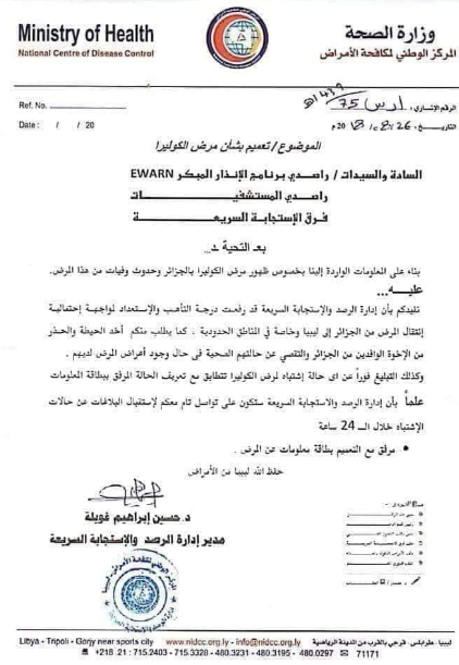 كما طلبت من مصالحها، التبليغ فورا عن أي حالة اشتباه لمرض الكوليرا تتطابق مع تعريف الحالة المرفق ببطاقة المعلومات .
