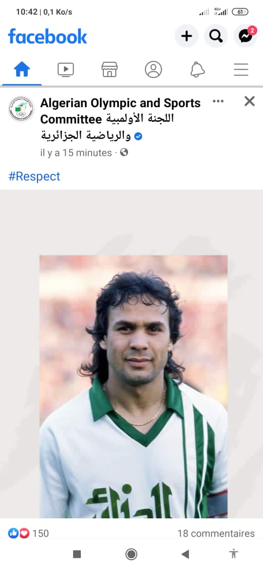 ونشر الحساب الرسمي للجنة الأولمبية، صبيحة اليوم الأربعاء، عبر صفحتها الرسمية على الفايسبوك، صورة للاعب الخضر السابق رابح ماجر، وأضافت عليها عبارة إحتراموا الأسطورة.