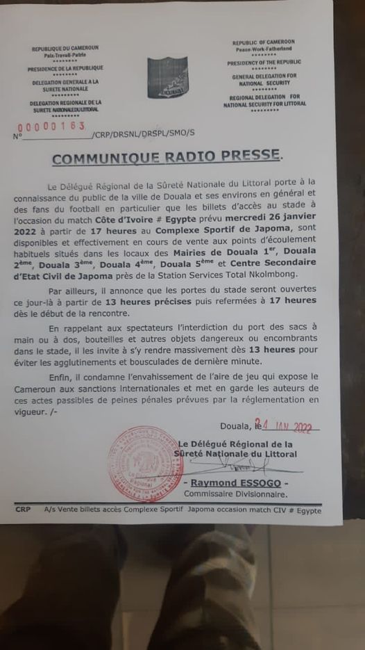 أعلنت اللجنة المنظمة لمنافسة كأس أمم إفريقيا على لسان المندوب الجهوي للأمن القومي بمدينة دوالا، عن قرارها الرسمي بشأن إغلاق ملعب جابوما من عدمه.