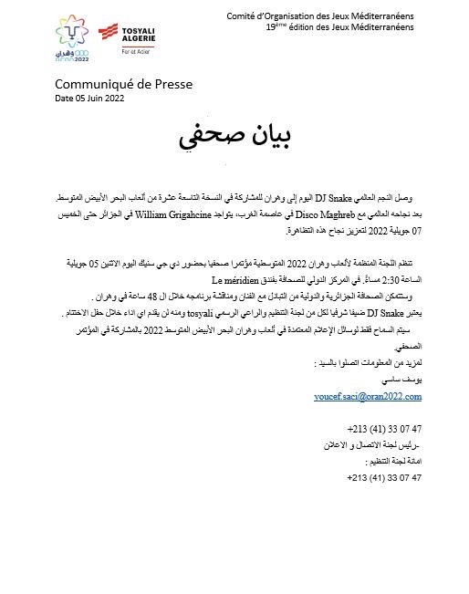 وحسب ماورد في بيان اللجنة المنظمة للألعاب المتوسطية عبر الفايسبوك، فإن اللجنة المنظمة للألعاب المتوسطية وهران 2022، ستنظم مؤتمراً صحفياً بحضور “ديجي سنايك”.