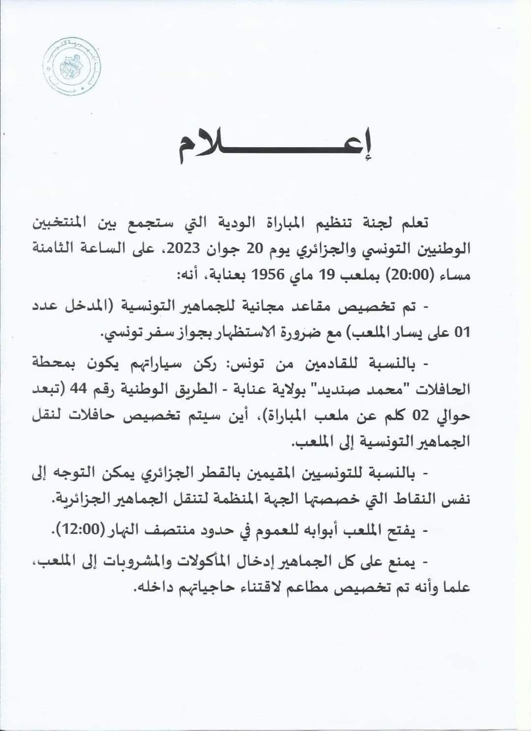 وفي الختام، نوه بيان اللجنة المنظمة لمواجهة الخضر ضد نسور قرطاج، بعدم إدخال المأكولات والمشروبات إلى الملعب، لأنه تم تخصيص مطاعم لإقتناء حاجياتهم.