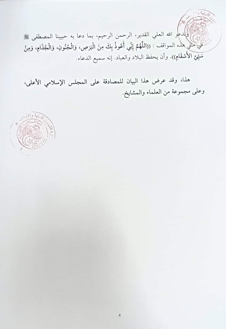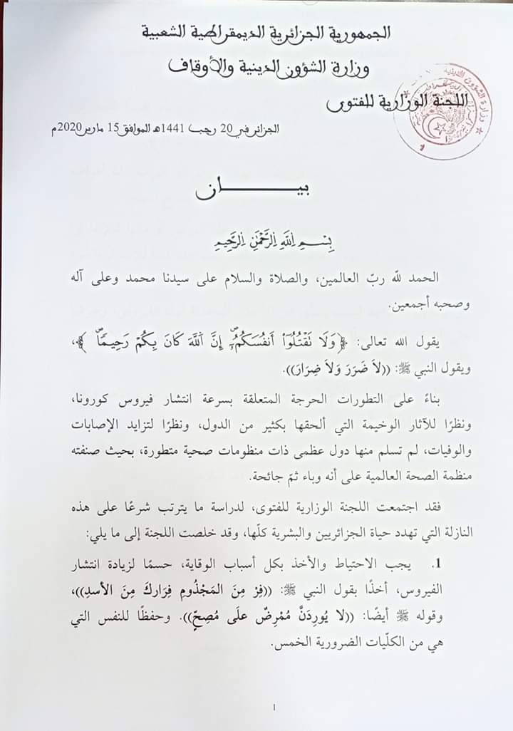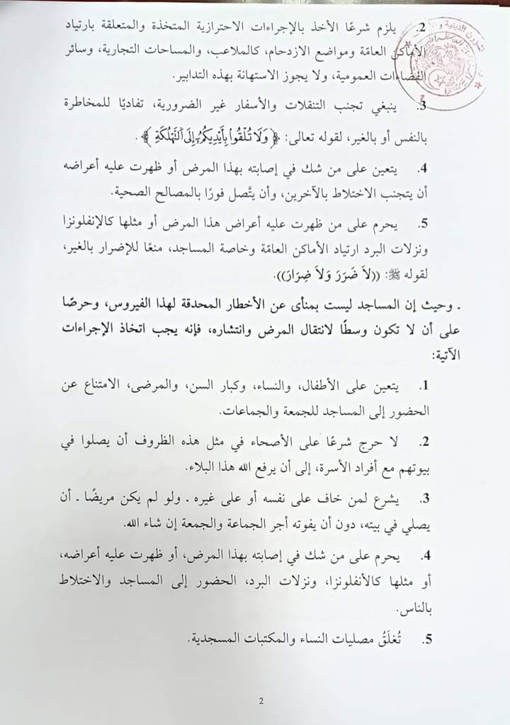 وقال البيان ان ارتياد الأماكن العامة والمساجد بالنسبة للمصابين بكورونا حرام، ويُحرم على من ظهرت عليه أعراض الأنفلونزا ونزلات البرد دخول المساجد