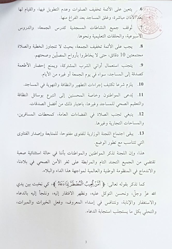 كما اعطت تعليمات للأئمة بغلق المساجد مباشرة بعد الفراغ من الصلوات، ووقف جميع نشاطات مثل درس الجمعة والدروس الأسبوعية والحلقات التعليمية و منع إحضار الأطعمة والأواني كصدقة للمساجد