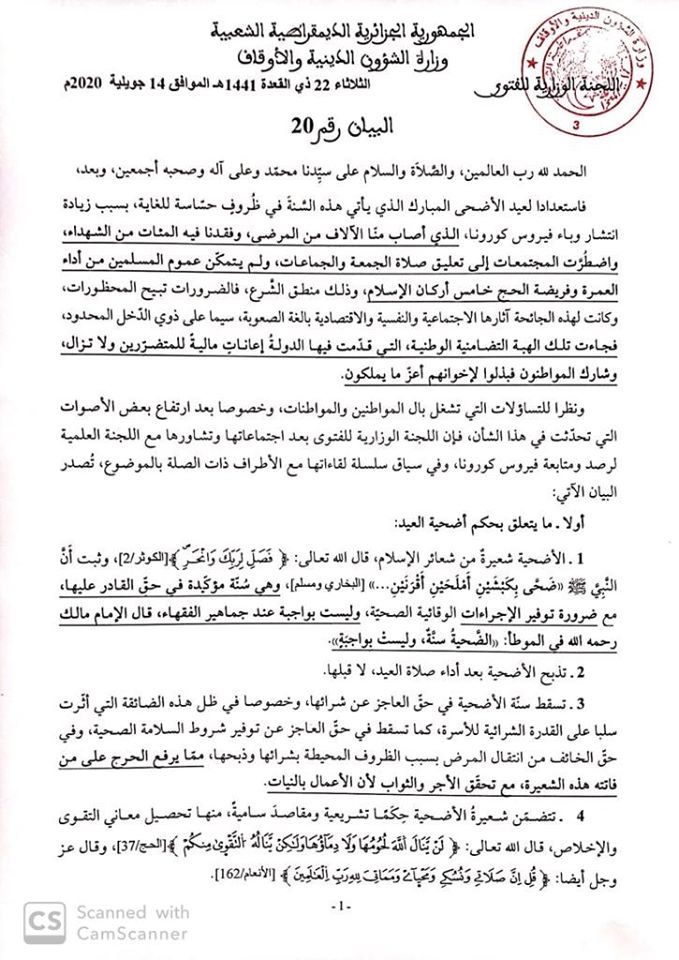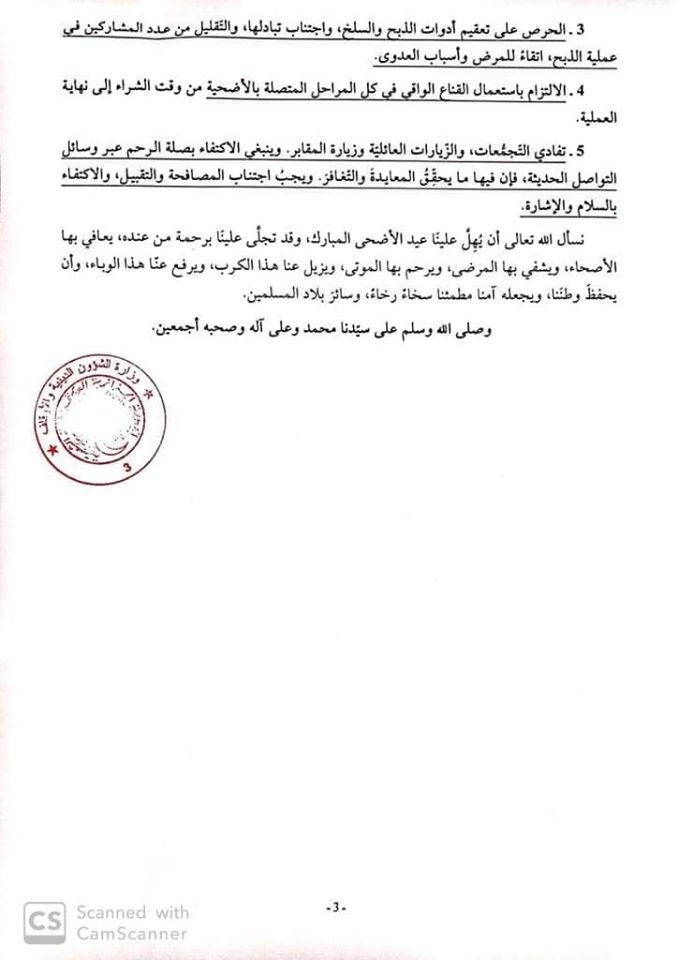 أصدرت لجنة الفتوى التابعة لوزارة الشؤون الدينية و الاوقاف بيان حول أضحية عيد الاضحى المبارك.