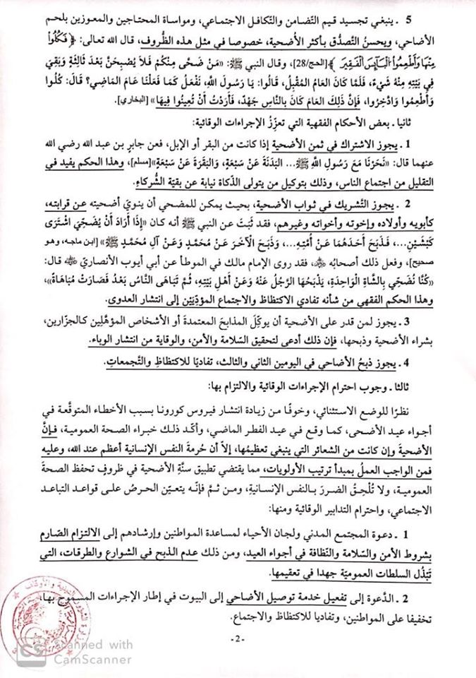 وقال البيان ان سُنّة الأضحية تسقط في حق العاجز عن شرائها خصوصا في ظل أزمة كورونا.