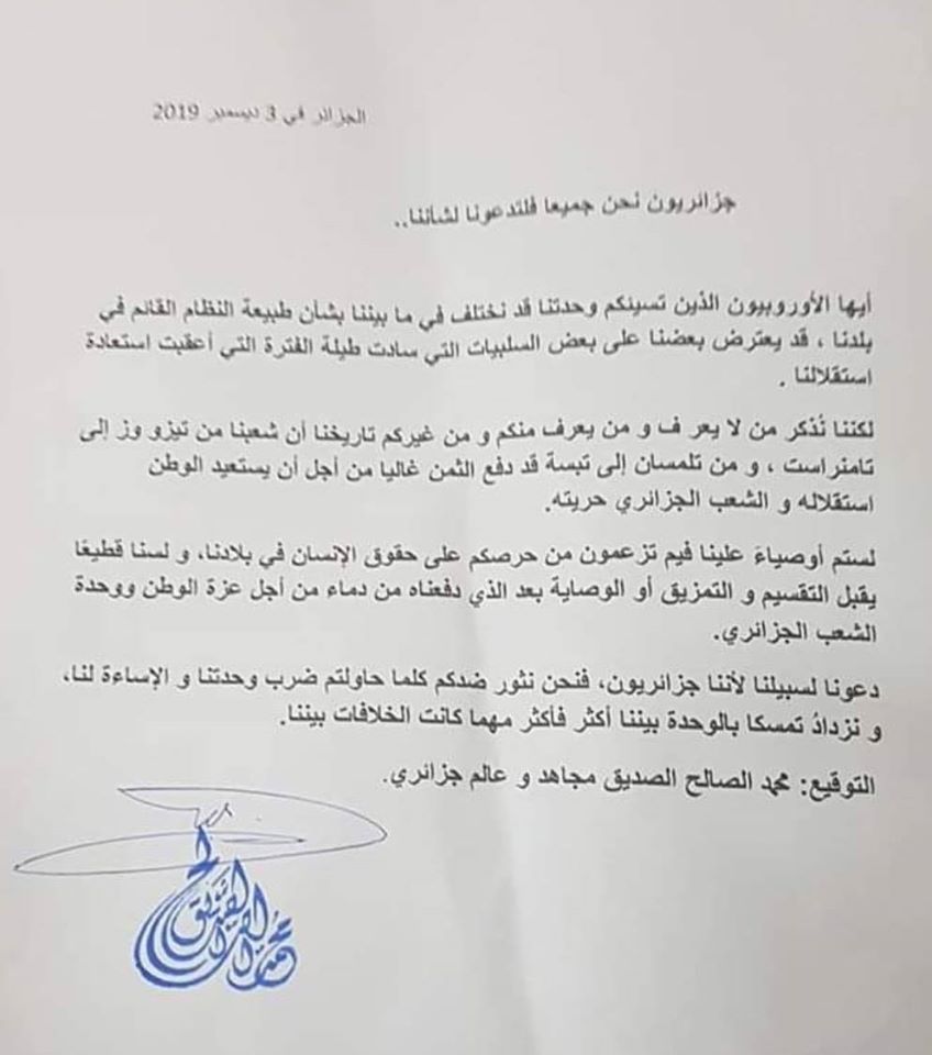 وإختتم العالم المجاهد محمد الصالح الصديق بالقول، دعونا لسبيلنا لأننا جزائريون فنحن نقول ضدكم كلنا حاولتم ضرب وحدتنا والإساءة لنا وتزداد تمسكا بالوحدة بيننا أكثر فأكثر مهما كانت الخلافات بيننا.