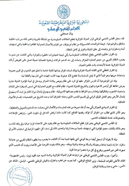 إن المجلس الشعبي الوطني يعتبر قرار قطع العلاقات الدبلوماسية مع نظام يقوم على الاعتداء قرارا صائبا وفي وقته المناسب وهو بذلك يكشف حجم المؤامرة التي تستهدف شعبنا ووحدة ترابنا وتتعدى ذلك إلى نسف كل الجهود الرامية إلى استتباب الأمن في المنطقة.