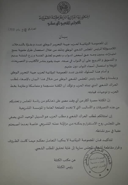 وطالبت المجموعة البرلمانية وبشدة أمام هذه التصرفات وفق البيان، رئيس البرلمان معاذ بوشارب، بالإصغاء لمطلب الحراك الشعبي الذي تبناه الحزب