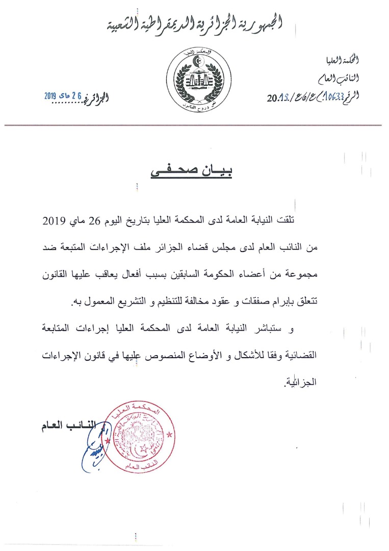 تلقت المحكمة العليا ملف الاجراءات المتبعة ضد الـ12 وزير و مسؤول من الحكومة السابقيين،  قادما لها من النائب العام لمجلس قضاء الجزائر.