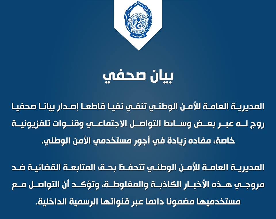 نفت المديرية العامة للامن الوطين ما تداولته بعض القنوات الفضائية والكثير من صفحات التواصل الاجتماعي عن زيادات في أجور الشرطة.