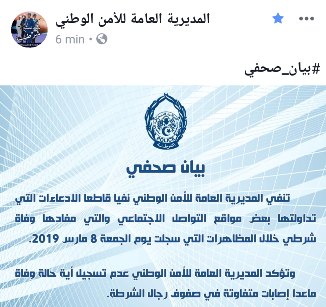 وحسب ما أعلنه اليوم رئيس خلية الاتصال والصحافة للمديرية العامة للأمن الوطني عبد الحكيم بلوار أنه لايوجد أي حالة وفاة لشرطي وفاة أي شرطي