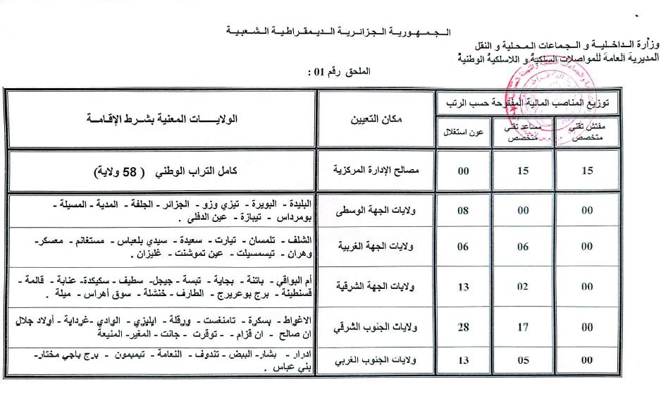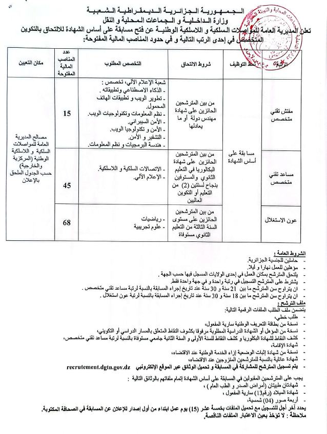وأوضحت المديرية أن المسابقة ستكون على أساس الشهادة للالتحاق بالتكوين المتخصص. في حدود المناصب المالية المفتوحة والمتمثلة في مفتش تقني متخصص، مساعد تقني متخصص، عون الاستغلال.