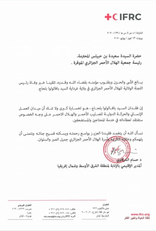 عزى المدير الإقليمي بالنيابة للحركة الدولية للهلال والصليب الأحمر في منطقة الشرق الأوسط وشمال إفريقيا حسام الشرقاوي الجزائر في وفاة بافلولوا الحاج رئيس اللجنة الولائية للهلال الأحمر في ولاية غرداية.