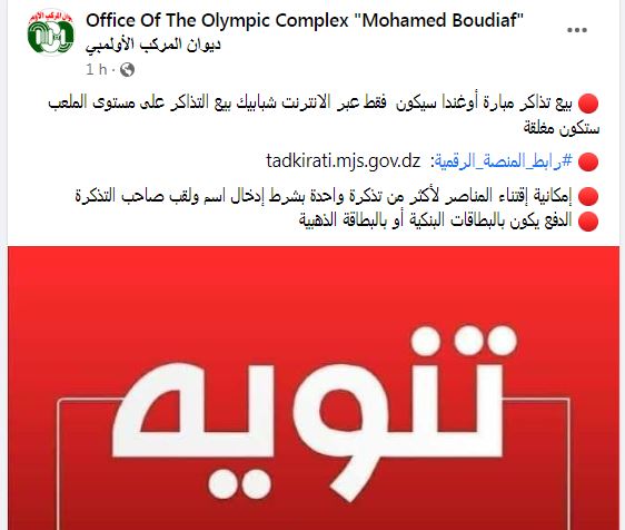 وأعلن المركب الأولمبي محمد بوضياف، في بيان عبر صفحته الرسمية بالفايسبوك، أن عملية بيع التذاكر، ستتم عبر الموقع :tadkirati.mjs.gov.dz.