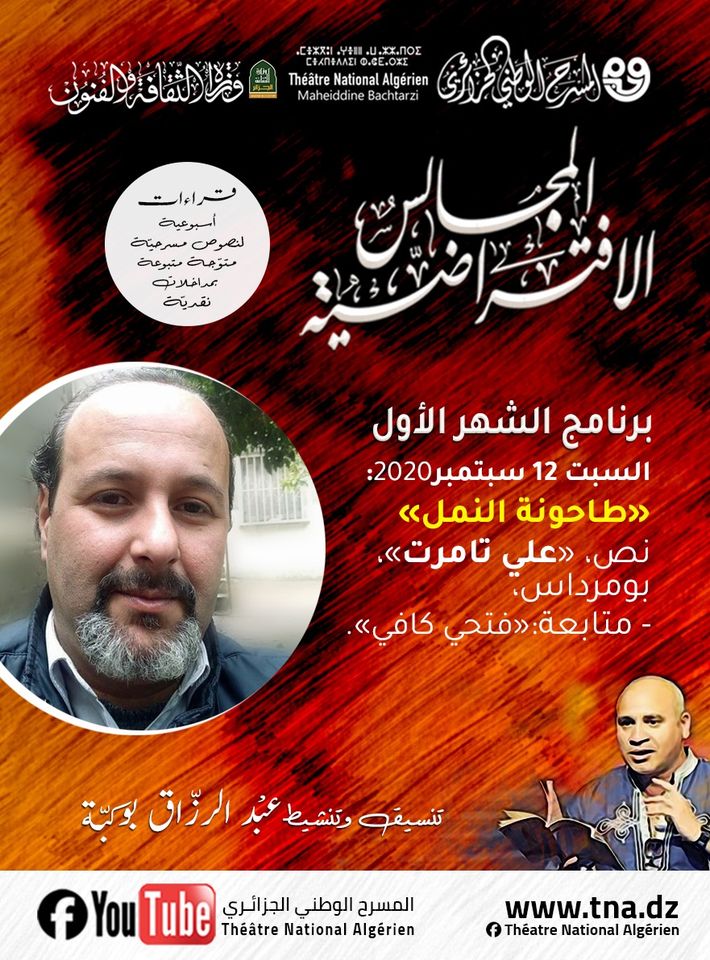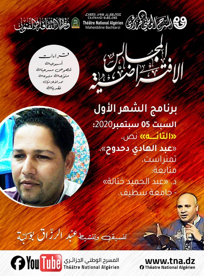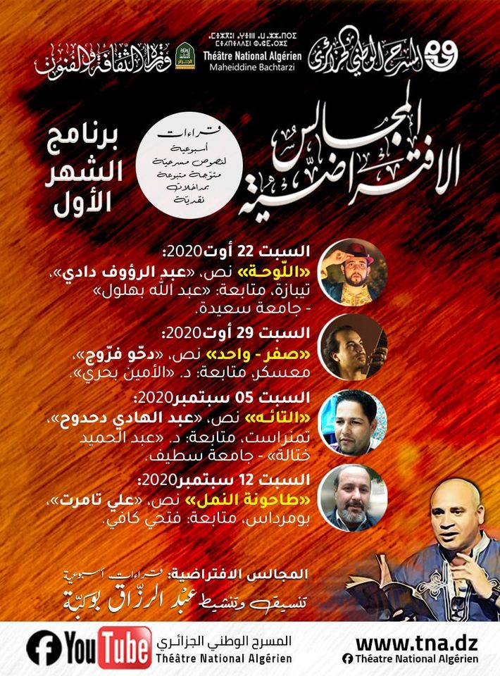 يستمر برنامج المجالس الافتراضية الذي انطلق يوم 22 أوت 2020، خلال شهر سبتمبر في تقديم قراءات في النصوص المسرحية للمسرح الوطني الجزائري.