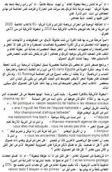 “اسوأ مرحلة مررت بها هذه الفترة اين كنت مكتوفة الايدي من الضغوطات و الاتهامات التي واجهتها اثناء المعسكرات”. “وكل الفترة التحضيرية للمنافسات المسطرة و ما كان عليا الا العمل والمثابرة صمتا زائد مجهودات الخاصة”. “اين انتظر نتيجة التحضيرات بمدالية في بطولة العالم و الذهب على الصعيد الافريقي بنوعيه (فردي و جماعي )”. “لكن لم يكتمل ذلك لغياب المصارعتين الاساسيتين معنا وبهذا تشتت الفريق النسوي” .