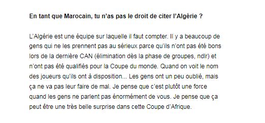 ولم يذكر اللاعب المغربي اسم الخضر، ما دفع بصحفي “أر أم سي” يطرح له سؤالا، إن كان ممنوعا من ذكر اسم الجزائر باعتباره مغربيا.