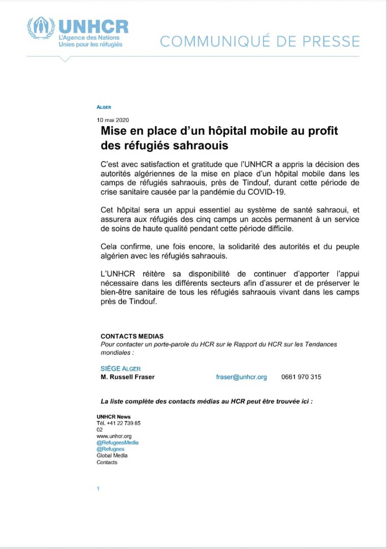 أعلنت المفوضية السامية للأمم المتحدة لشؤون اللاجئين، عن ارتياحها وامتنانها بقرار السلطات الجزائرية إنشاء مستشفى ميداني في مخيمات اللاجئين الصحراويين.