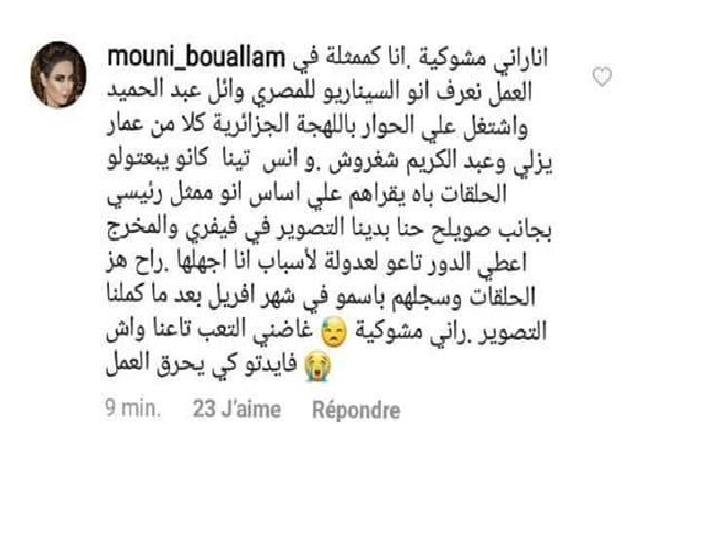 وقالت موني بوعلام في تعليق عن المسلسل انها منزعجة من ما يقوله انس تينا عن سيناريو المسلسل.
