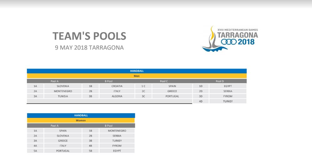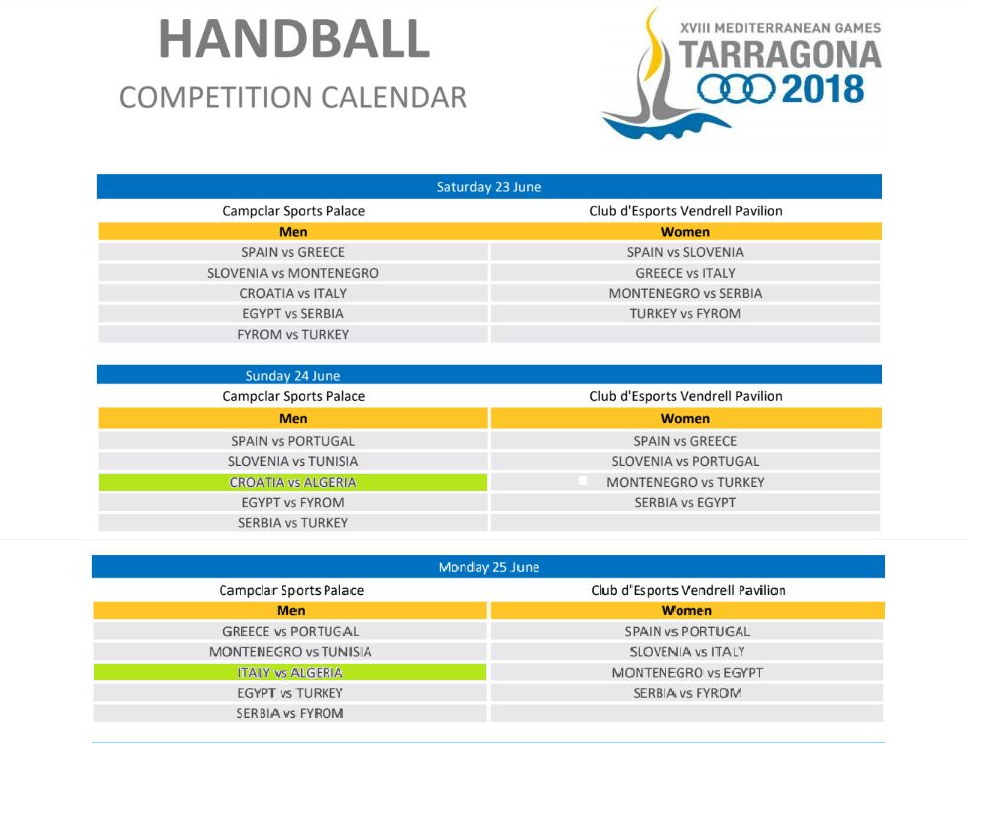 سيلعب المنتخب الجزائري لكرة اليد (أكابر رجال)، ضمن المجموعة الثانية، في ألعاب البحر الأبيض المتوسط، المقررة بمدينة تراغونا الإسبانية.