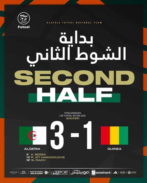 حقق المنتخب الوطني الجزائري لكرة القدم داخل الصالات (فوتصال) فوزًا كاسحًا على نظيره الغيني بنتيجة (7-1)، في مباراة جمعتهما، اليوم الأحد، ضمن تصفيات كأس أمم إفريقيا “كان 2026”.