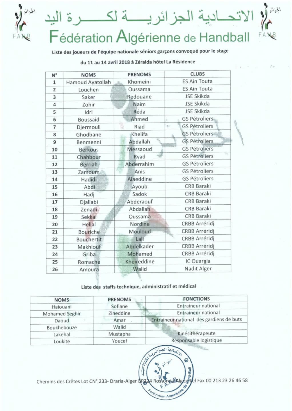 واستدعى المدرب الوطني، سفيان حيواني، قائمة موسعة من اللاعبين للمشاركة في هذا التربص التحضيري، والتي ضمت 26 لاعبا محليا.