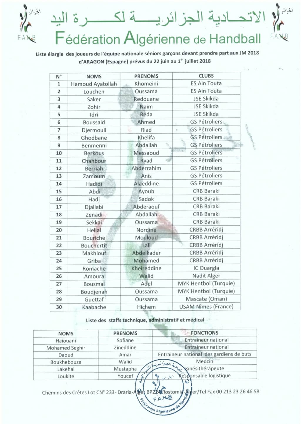 وجاءت قائمة العناصر الوطنية المعنية بهذا التربص، على النحو التالي: