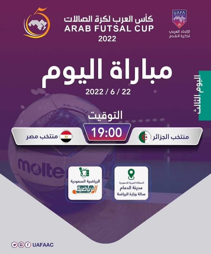 وستُلعب مباراة اليوم الثالث من المنافسة العربية بقاعة مدينة الدمام بداية من الساعة الـ19.00 بالتوقيت السعودي، وعلى الساعة 21.00 بالتوقيت المحلي.