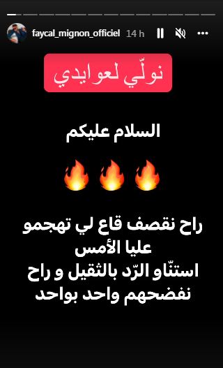 في حين، ومن جهة أخرى، شكر فيصل المينيون كل من وقف إلى جانبه، وشجعه على رغبته وطموحه المستقبلي. وقال الفنان، في أحد فيديو نشره عبر ستوري الانستغرام “أنا لم اعد فيصل الماضي، ولن أرد عليكم”.