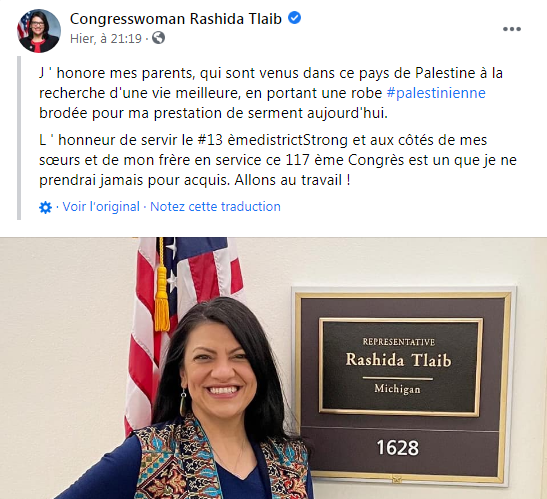 بالزي الفلسطيني أدت النائبة رشيدة طليب القسم بالكونغرس الأمريكي عقب فوزها للعهدة الثانية بعضوية مجلس النواب عن ولاية ميتشغان.