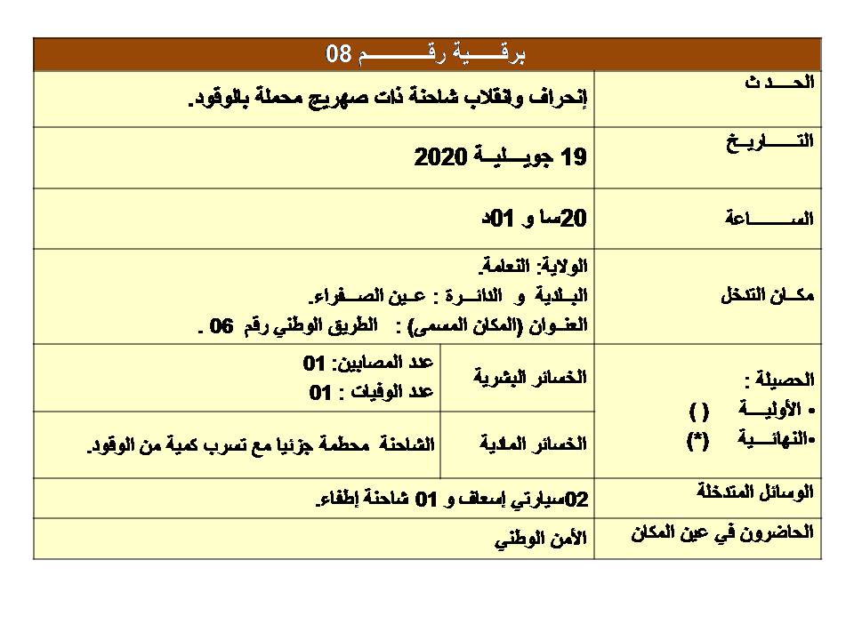 وحسب بيان مصالح الحماية المدنية، فغن الحادث وقع بالطريق الوطني رقم 6، إثر إنحراف وإنقلاب شاحنة ذات صهريج محملة بالوقود.