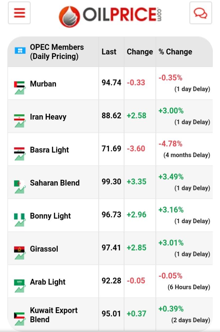 كما قد تم تداول العقود الآجلة للخام الأمريكي “غرب تكساس الوسيط” عند 89.51 دولار للبرميل، بتراجع نسبته 0.41% عن سعر الإغلاق السابق.