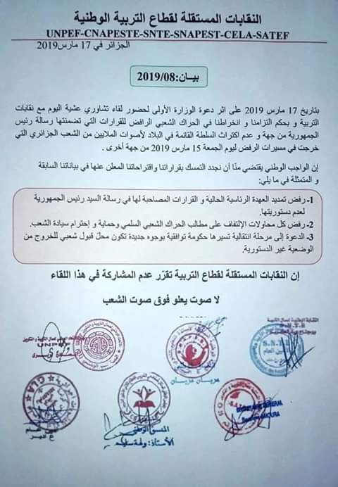 رفضت النقابات المستقلة لقطاع التربية الوطنية وهي ست نقابات، اليوم الاجتماع مع الوزير الأولى نور الدين بدوي.