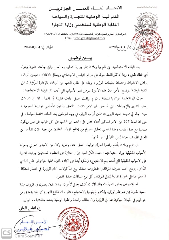 أوضحت النقابة الوطنية لمستخدمي وزارة التجارة أن الوقفة الاحتجاجية التي قام بها موظفو وزارة التجارة أمس جاءت بعد تعليمة الوزير.