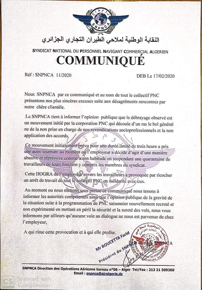 أكدت النقابة الوطنية لملاحي الطيران التجاري الجزائري، أنّ النقابة قد أعلمت الإدارة بقرار التوقف عن العمل لمدة 3 ساعات في إطار حركة احتجاجية.