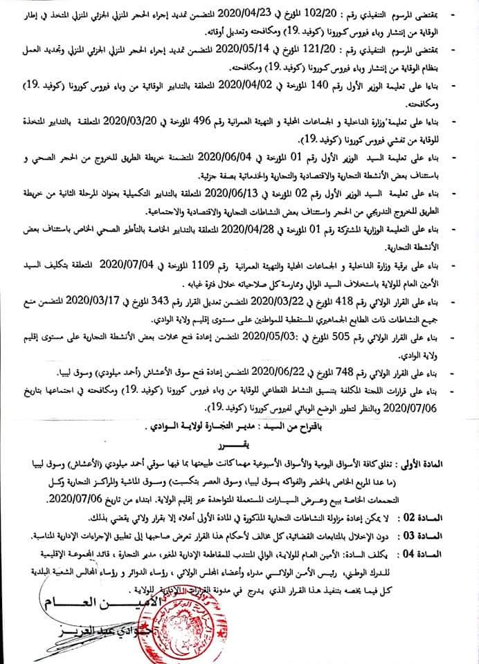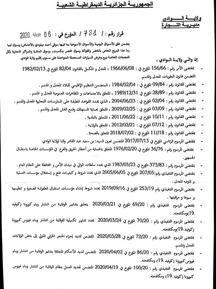 أمضى، عبد العزير جوادي، الأمين العام لولاية الوادي، قرارا ولائيا بعد التزايد الكبير للمصابين بكوفيد 19، بغلق التام لكافة الأسواق اليومية والأسبوعية، مهما كانت طبيعتها.