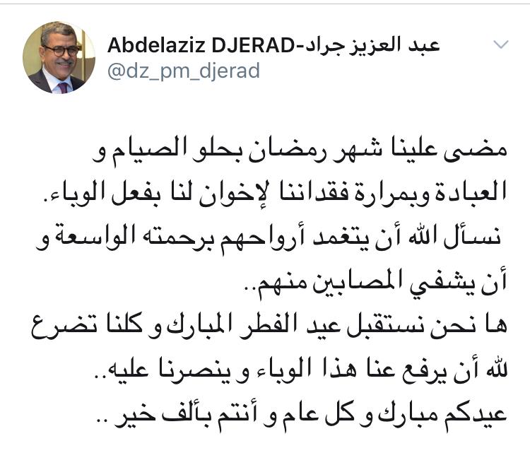 وكتب الوزير الاول عبر صفحته على التويتر “مضى علينا شهر رمضان بحلو الصيام والعبادة وبمرارة فقداننا لإخوان لنا بفعل الوباء.”
