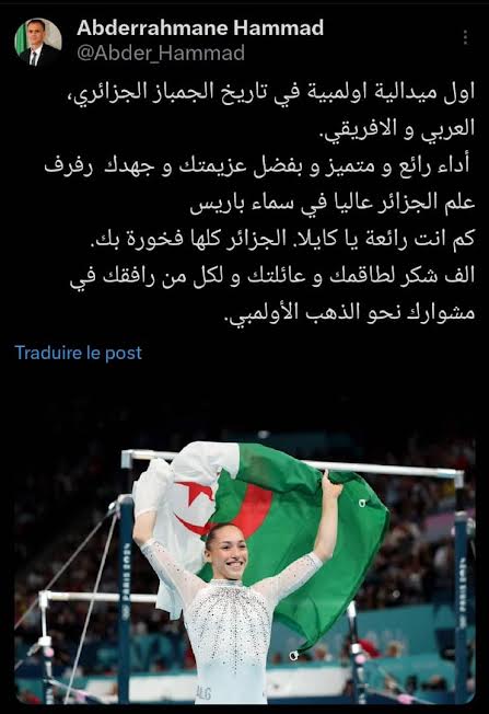 وقال وزير الشباب و الرياضة في منشور له على منصة “إكس” اليوم الأحد “أول ميدالية أولمبية في تاريخ الجمباز الجزائري العربي و الإفريقي، اداء رائع و متميز و بفضل عزيمتك و جهدك رفرف علم الجزائر عاليا، في سماء باريس”.
