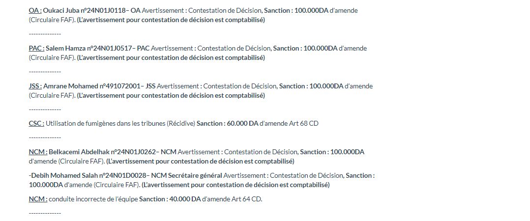 ولحساب ذات اللقاء تم تغريم ثلاثي بسكرة، نصر الدين خوالد ولخضاري عادل وبوزيان محمد أمين. بـ 10 ملايين سنتيم، بسبب الاحتجاج على قرارات الحكم. مع توقيف اللاعب بورحلة سعيد، إلى غاية جلسة الاستماع المقررة هذا الخميس.