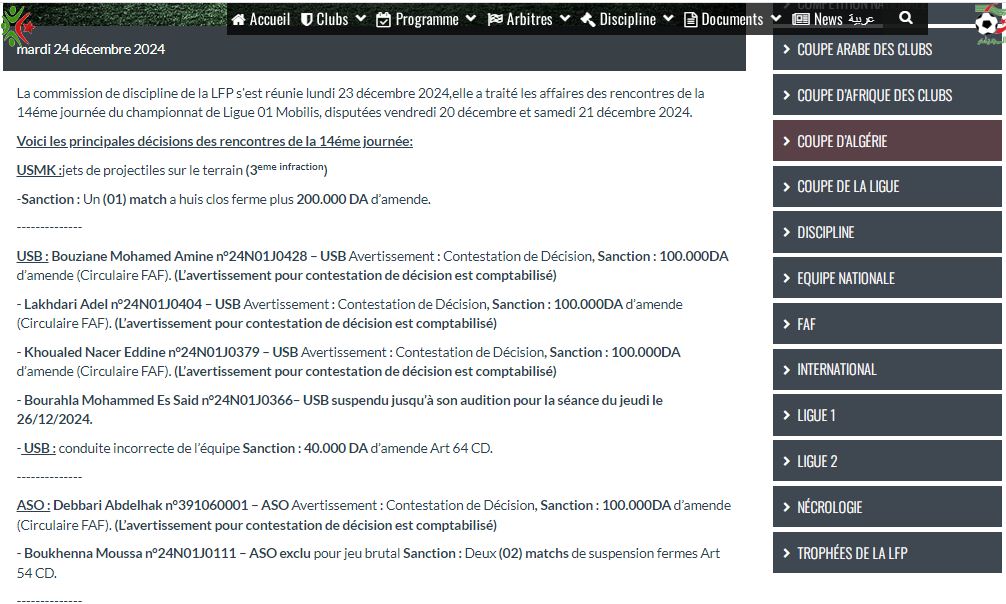 أعلنت لجنة الانضباط التابعة للرابطة المحترفة لكرة القدم، عن قراراتها الخاصة بالجولة الـ 14، والتي لُعبت يومي الـ 20 والـ 21 ديسمبر الجاري.