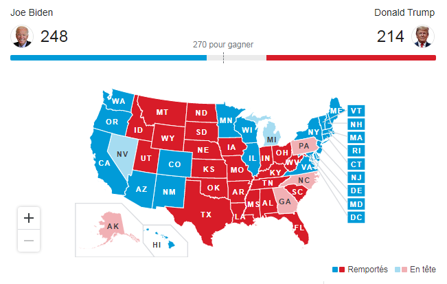 وحسب مختلف المواقع الأمريكية، فإن بايدن الى حد الساعة متحصل على 248 صوت، في حين يمتلك ترامب 214 صوت.