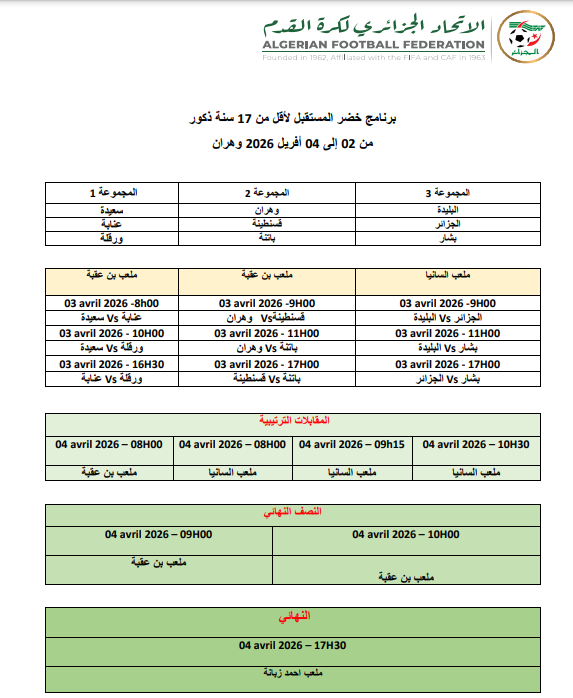 وسيكون البرنامج الكامل لمباريات هذه الطبعة الثالثة لدورة “خضر المستقبل”، على النحو التالي: