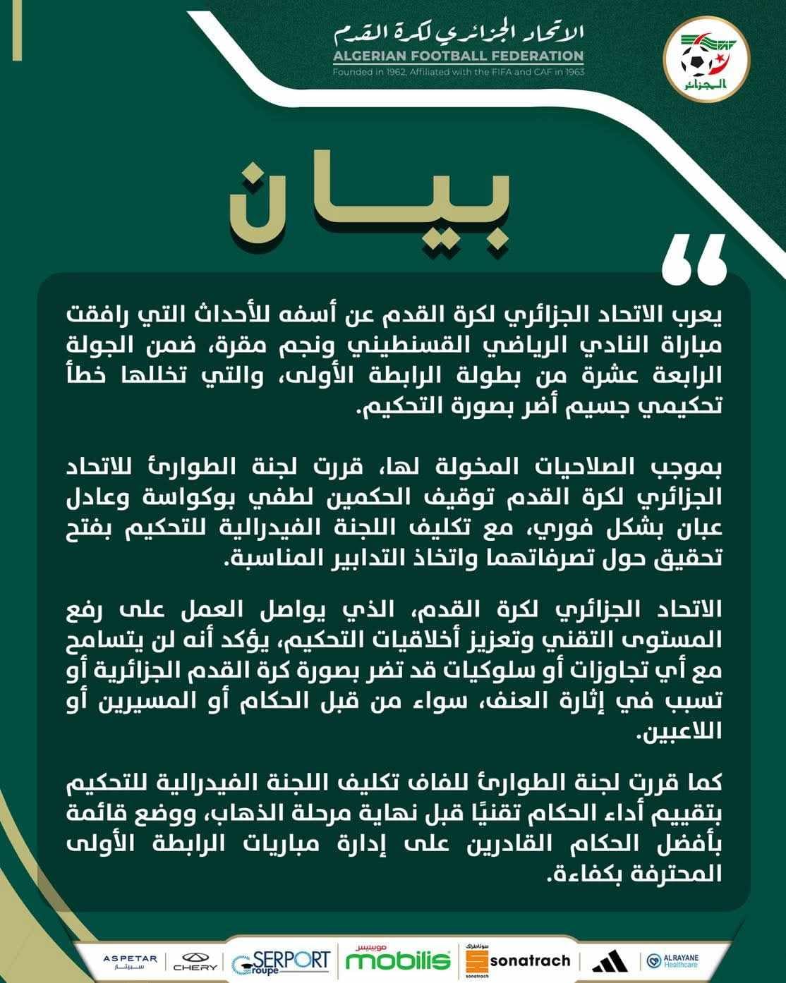 مبرزة بأن لجنة الطوارئ لـ “الفاف” بموجب الصلاحيات المخولة لها. قررت توقيف الحكمين لطفي بوكواسة وعادل عبان بشكل فوري. مع تكليف اللجنة الفيدرالية للتحكيم بفتح تحقيق حول تصرفاتهما واتخاذ التدابير المناسبة.