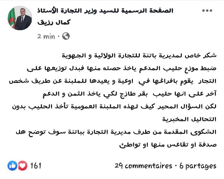 وكشف وزير التجارة عبر صفحته الرسمية، حيثيات القضية، التي تعود إلى أنّه يوجد موزع حليب بباتنة، يأخذ حصته من ملبنة عمومية بذات الولاية، وبدل توزيعها على التجار، يقوم بإفراغها في أوعية.
