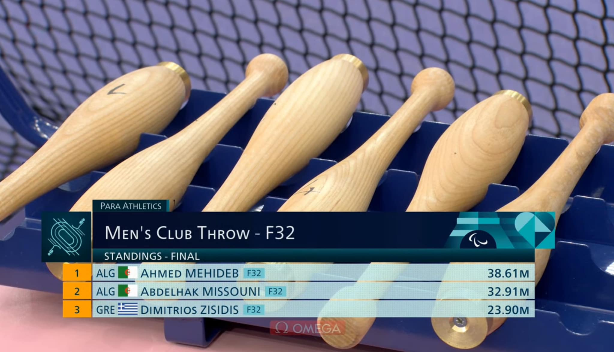 و حقق البطل الجزائري، أحمد مهيدب المركز الثالث في نهائي رمي الصولجان F32، محرزا الميدالية البرونزية، برمية قدرها 38.61 متر.