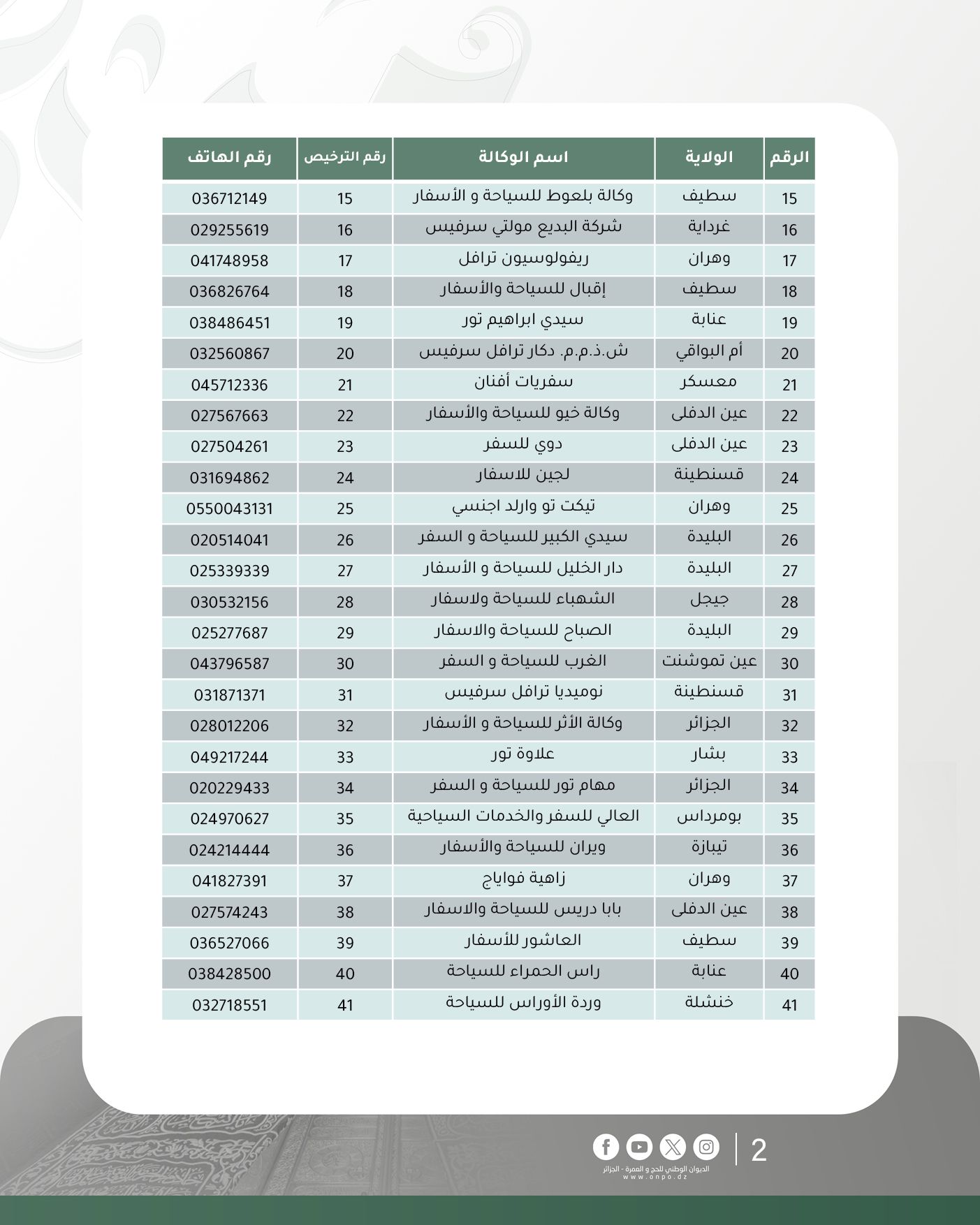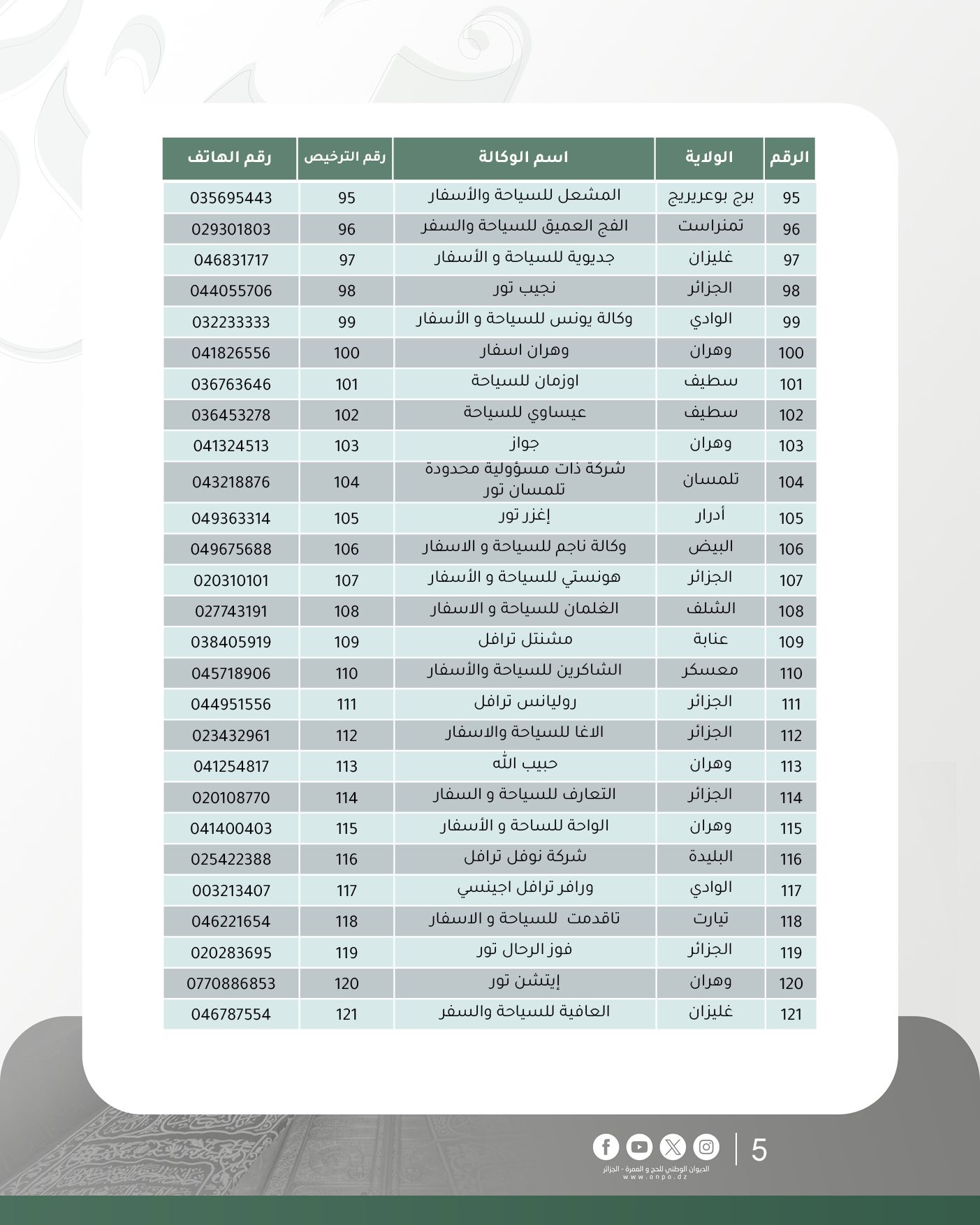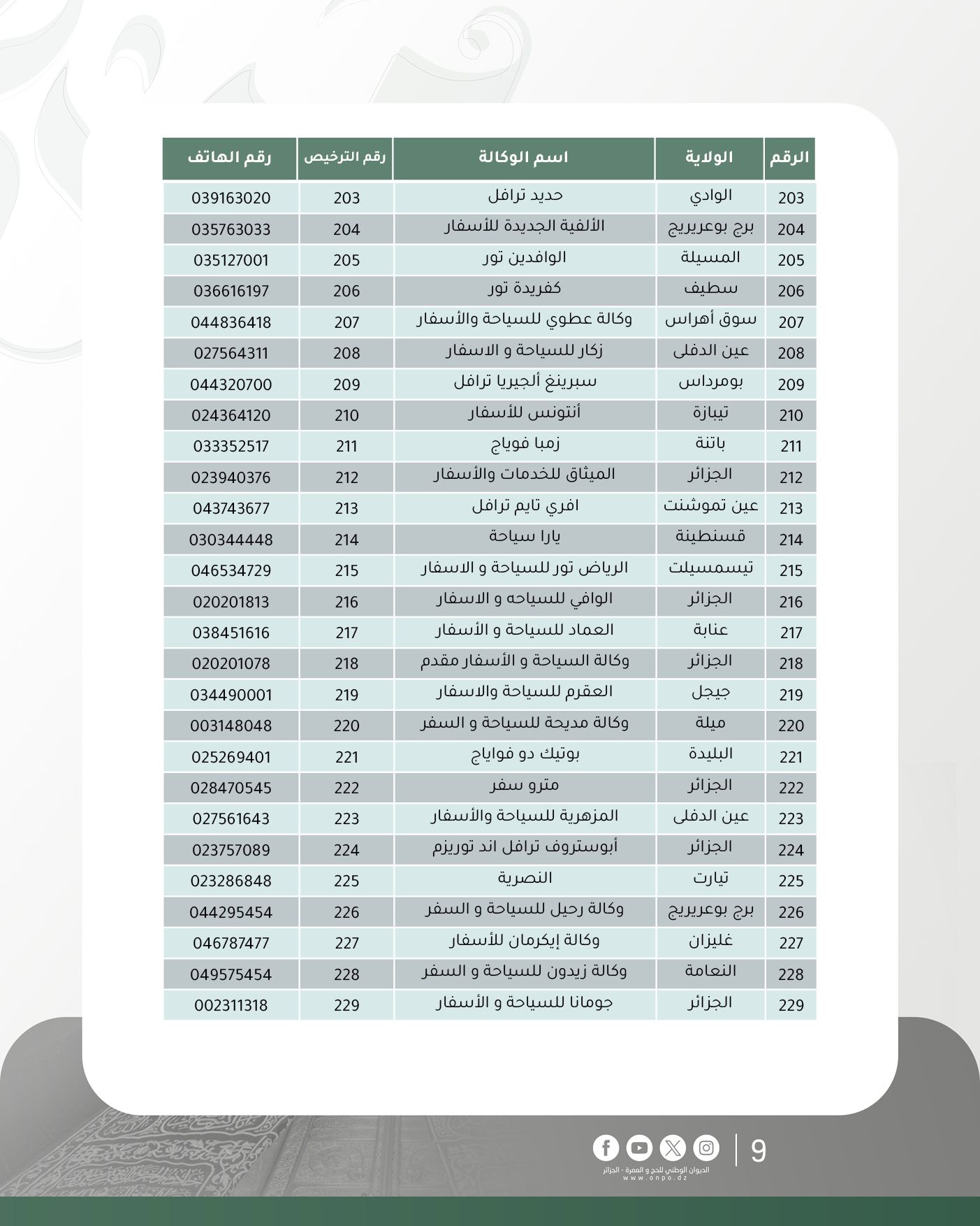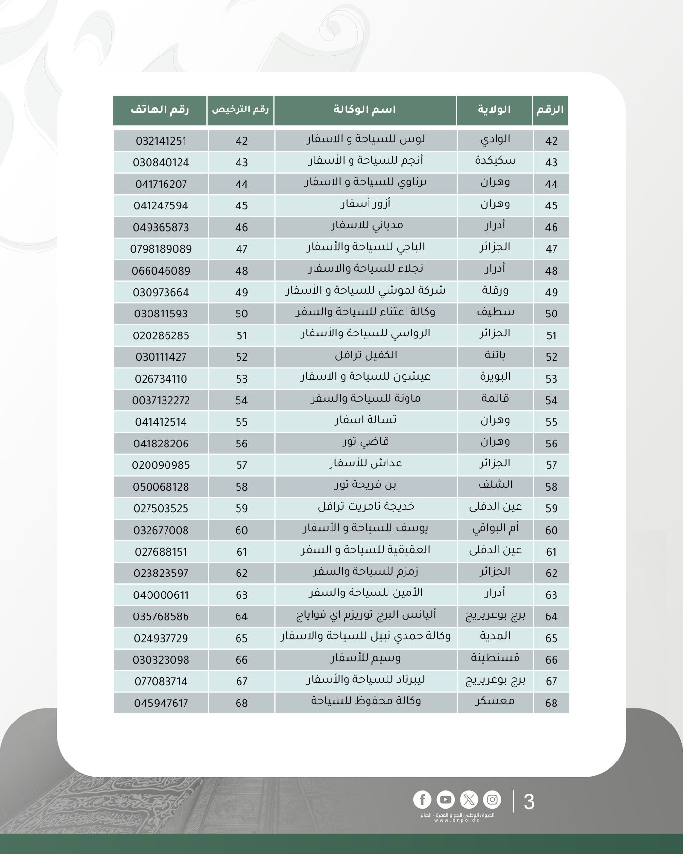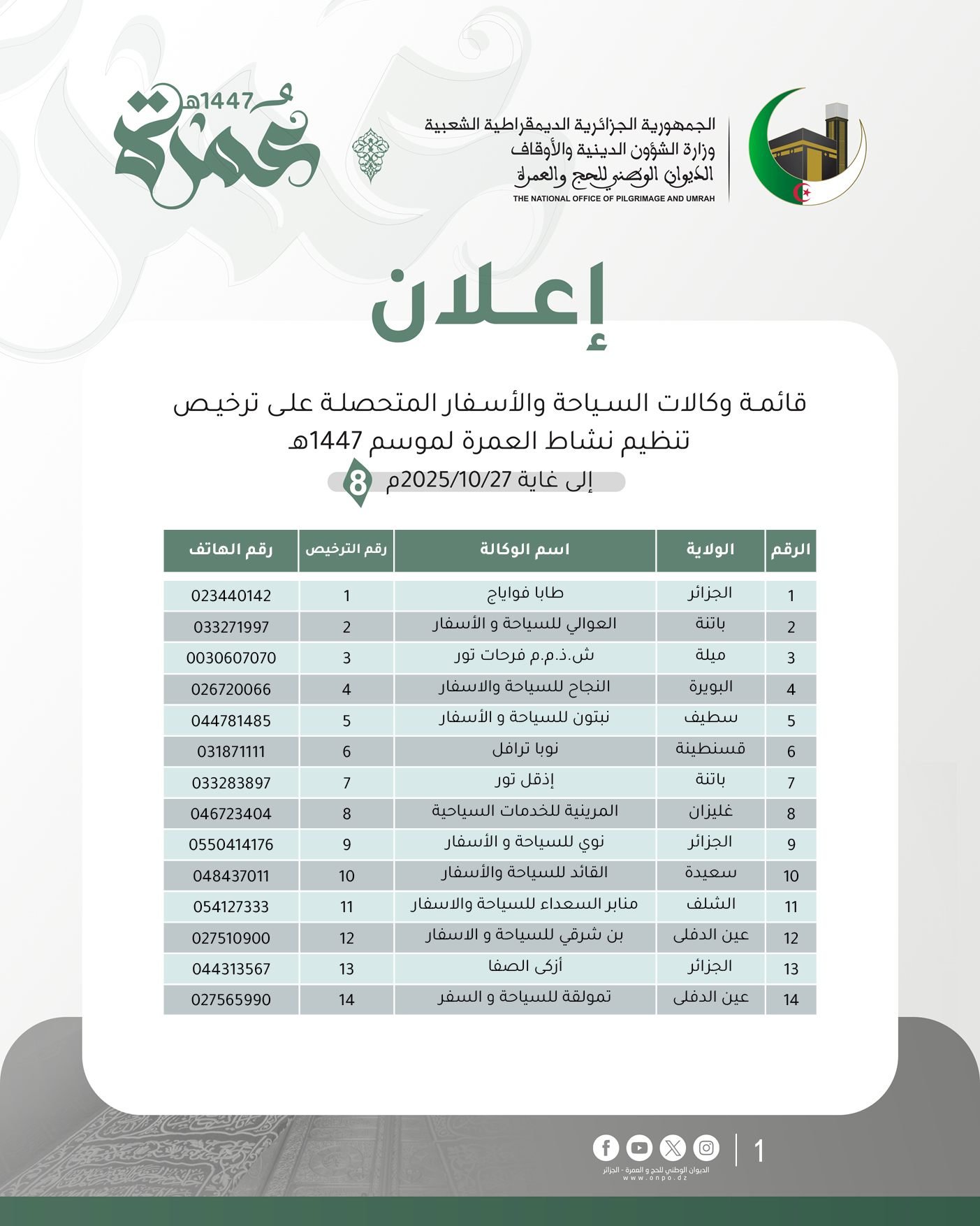 أعلن الديوان الوطني للحج والعمرة، عن قائمة وكالات السياحة والأسفار المتحصلة على ترخيص تنظيم العمرة لموسم 1447هـ.