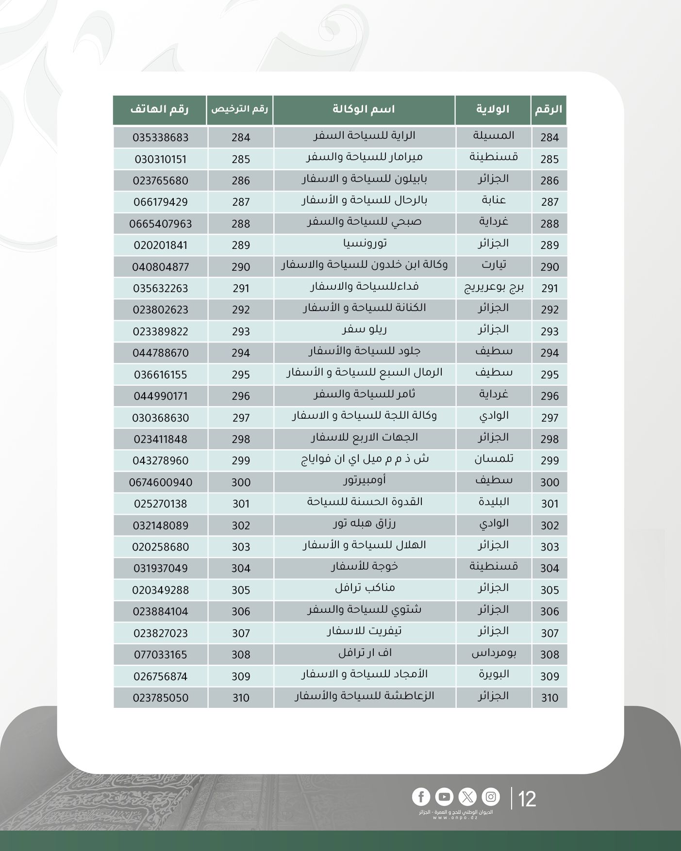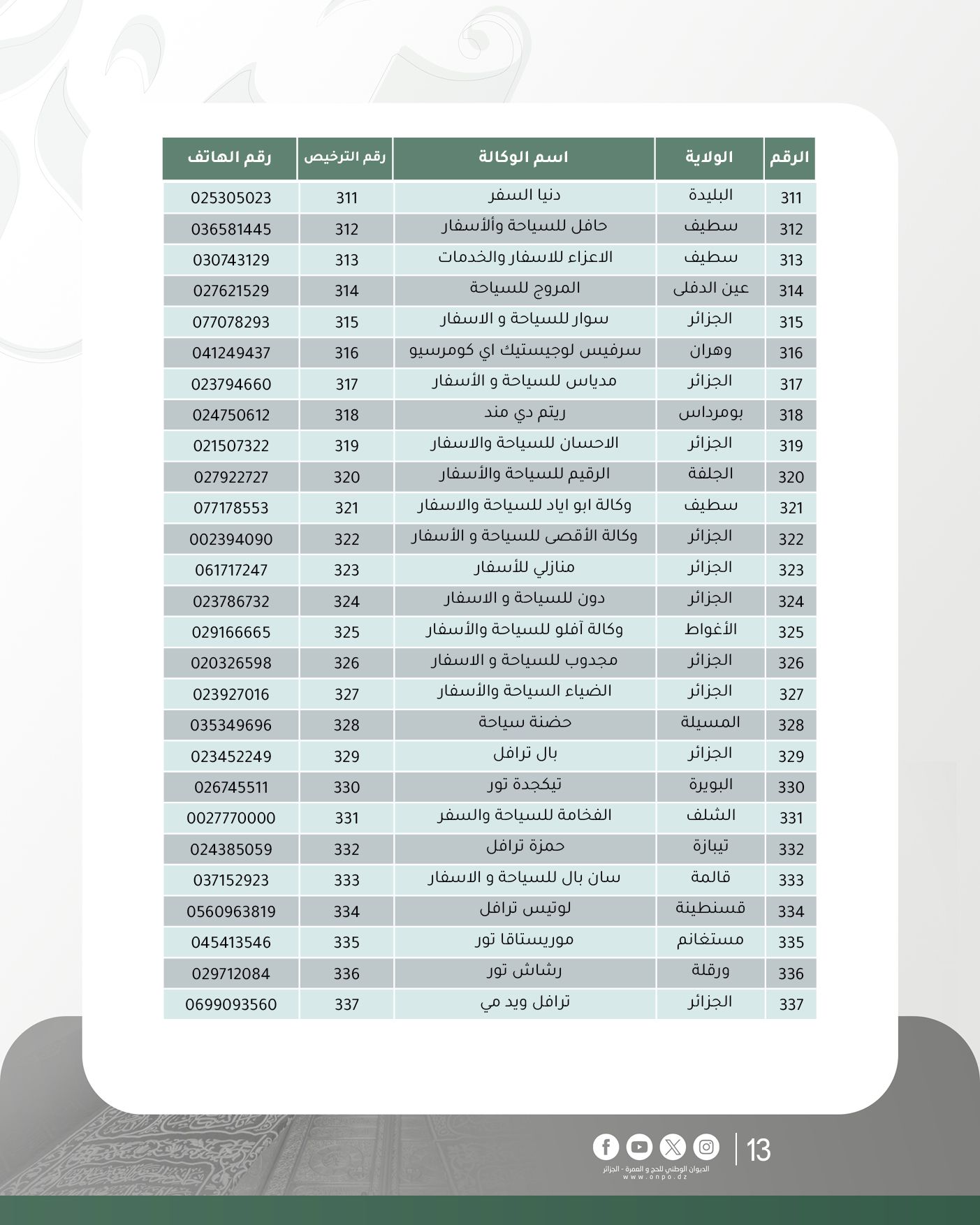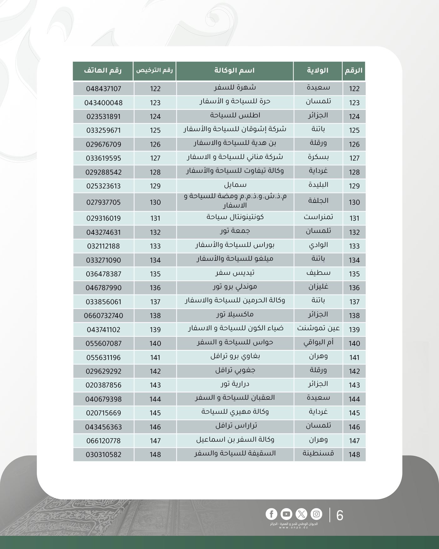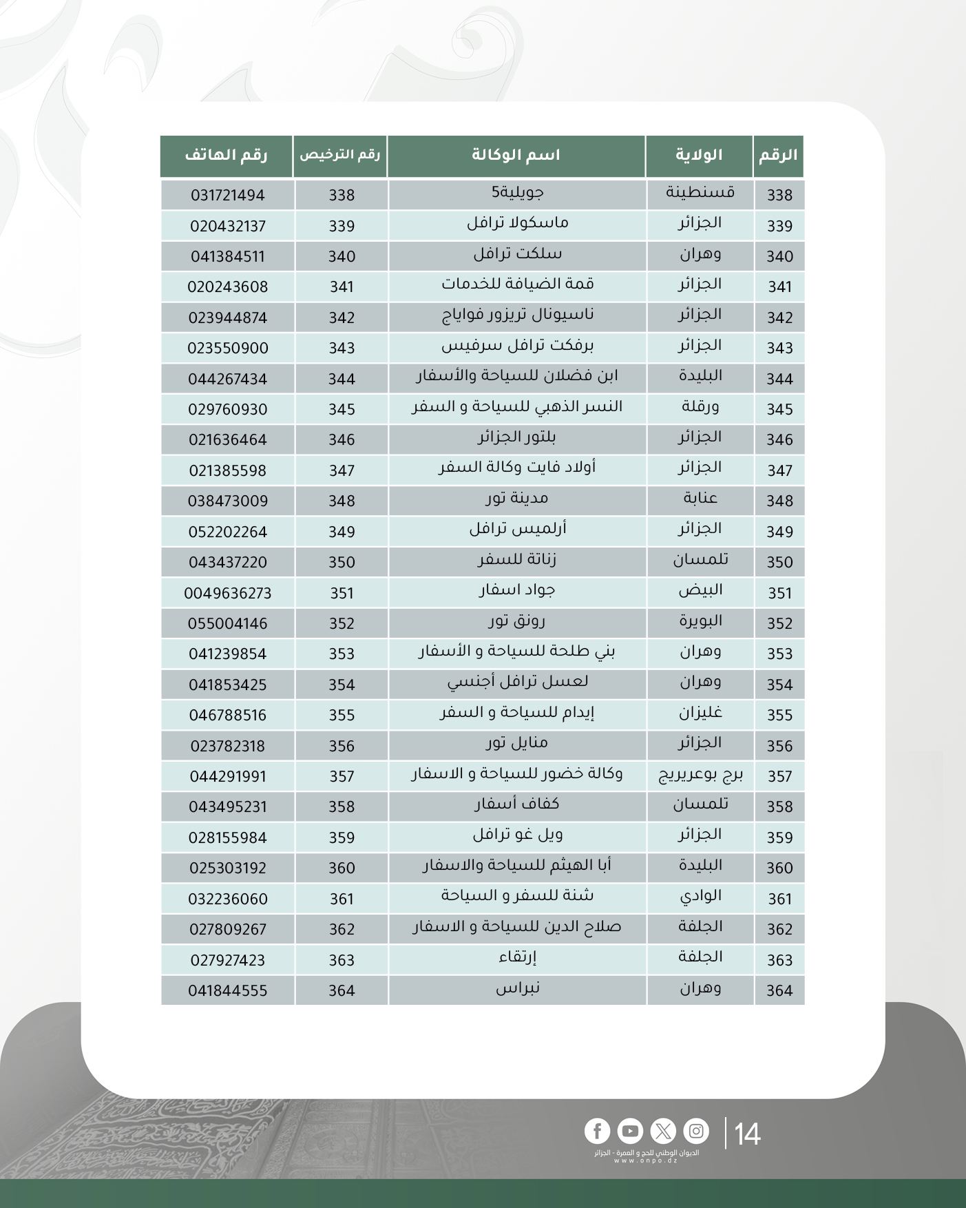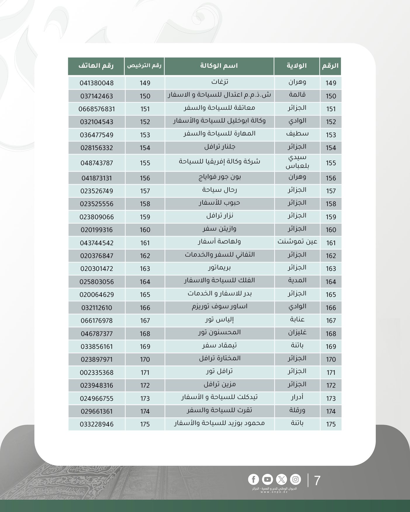 أعلن الديوان الوطني للحج والعمرة، عن قائمة وكالات السياحة والأسفار المتحصلة على ترخيص تنظيم العمرة لموسم 1447هـ.
